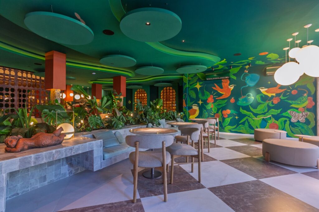 Além desse especial, há também uma outra opção que expressa sofisticação e beleza: o “Café Verde MiraFlores”, assinado pela Paloma Arquitetura e Design. O ambiente usa estratégias da neurociência aplicada à arquitetura para promover o bem-estar. A paleta de cores destaca o verde e tons terrosos, com pedras naturais e formas orgânicas. Círculos se repetem em lustres e mesas, evocando alegria. A área “reunião no jardim” simula o exterior com luz natural, pergolado e plantas.
