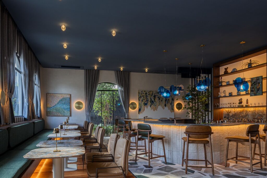 E não para por aí! Para quem deseja experimentar ótimos drinks, pode visitar o “B. Arte”, assinado por Isabela Portela. O ponto de partida do bar é o design do balcão central em formato de trevo, que simboliza sorte e crescimento. Este elemento é o coração do bar e também convida à socialização, promovendo interações mais próximas entre o público. Inspirado pelo icônico estilo Art Déco, o projeto destaca uma paleta de cores vibrantes e linhas geométricas, acentuadas por sofisticados detalhes em dourado.