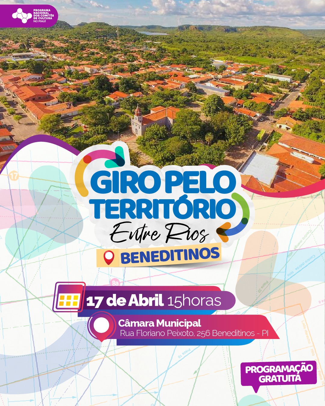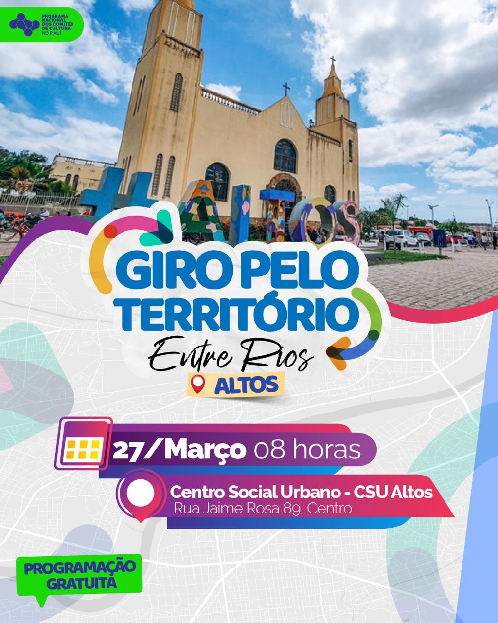 O Giro Pelo Território Entre Rios, ação integrante do Programa Nacional dos Comitês de Cultura (PNCC-PI), será realizado em Beneditinos no dia 17 de abril de 2026, às 15h, na Câmara Municipal. O PNCC-PI tem papel essencial na consolidação da cultura como direito e como instrumento de cidadania, fortalecendo os comitês locais, ampliando o acesso às políticas culturais e valorizando a diversidade artística e os saberes tradicionais das comunidades. Sua importância está em descentralizar as ações culturais, estimular a criatividade e preservar a memória coletiva, criando espaços de diálogo e protagonismo para agentes culturais.